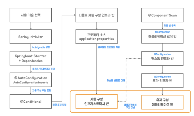 스프링 부트는 @Configuration이 붙은 클래스를 확인하고 조건에 따라 사용자 정의한 인프라 빈으로 교체하는 과정을 거친다.