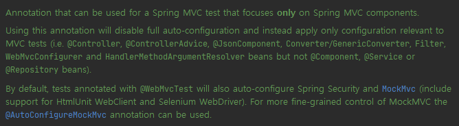보면 Spring Security와 MockMvc 기본 자동 구성으로 사용하며, @Controller, @ControllerAdvice. Converter와 같은 Bean들을 로딩하며 @Component, @Service, @Repository는 빈으로 등록하지 않는다.라고 쓰여있다.