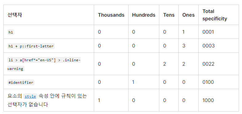 기본적으로 선택자의 선택이 얼마나 구체적인지에 대한 척도입니다.