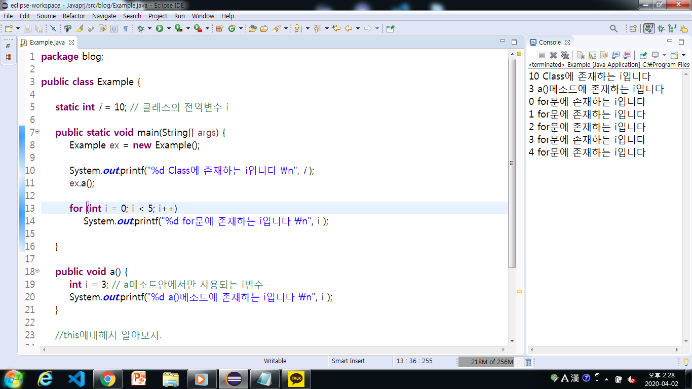 for문이나 a() 메서드 안에 선언된 i와 달리 클래스 내부에서 선언과 초기화를 해줬기 때문에 클래스 내부 어디에서든 사용할 수 있습니다.