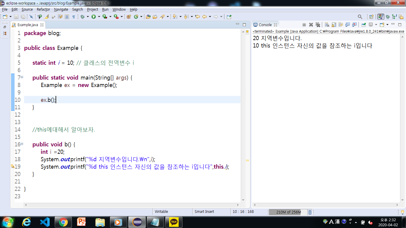 이때 사용하는 키워드가 this입니다. this를 사용하게 되면 인스턴스 자신을 의미하게 됩니다.