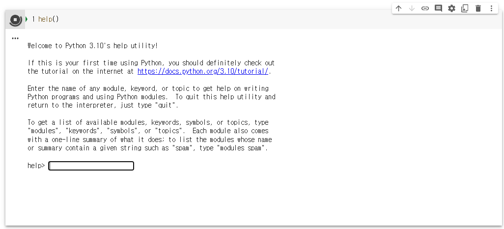 help 함수는 대화형 도움말 시스템 호출 또는 클래스나 메소드의 사용방법을 반환해준다.