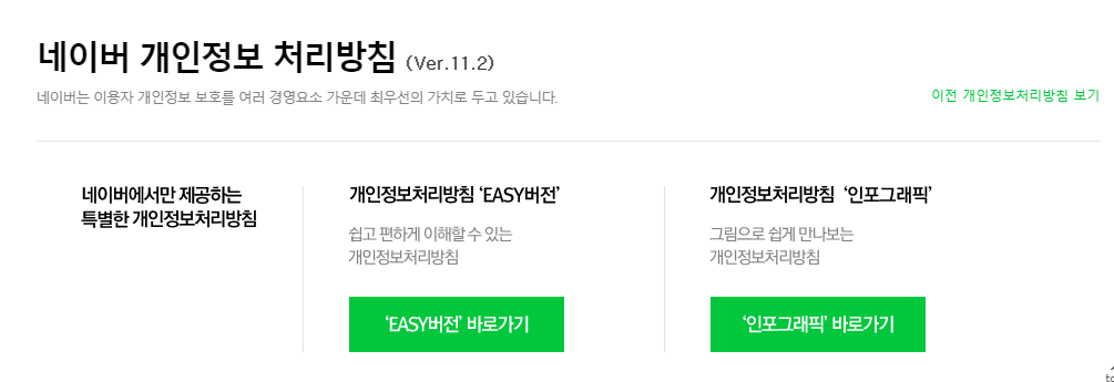네이버 개인정보 처리방침 (Ver.11.2) 네이버는 이용자 개인정보 보호를 여러 경영요소 가운데 최우선의 가치로 두고 있습니다. 이전 개인정보처리방침 보기 네이버에서만 제공하는 특별한 개인