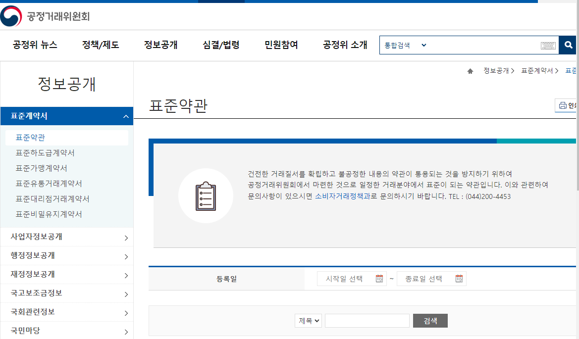 정보공개의 표준약관에 들어가면 다음과 같이 검색할 수 있다.