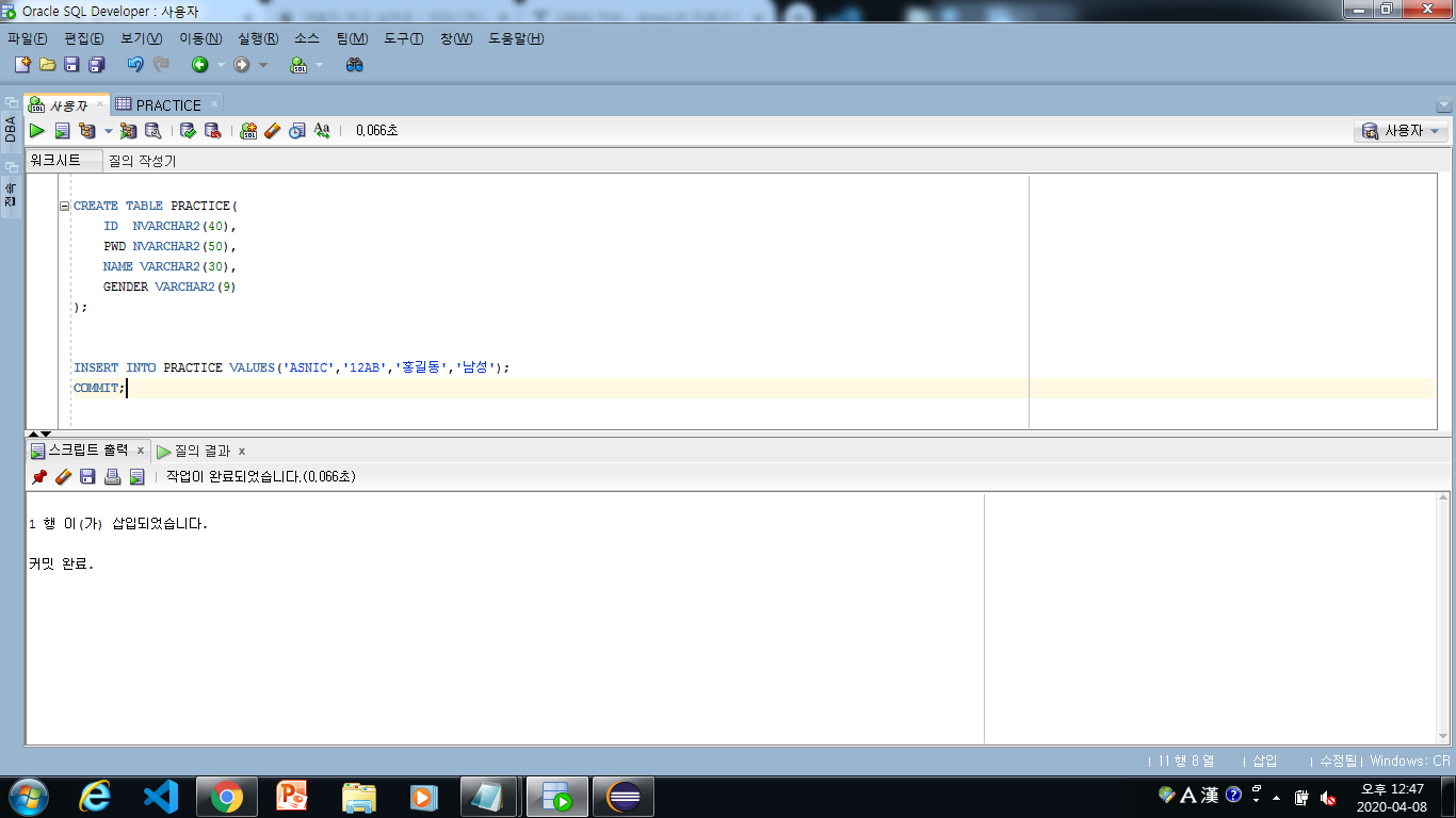 PRACTICE 테이블의 NAME= '홍길동'을 석봉 아로 변경해보겠습니다.