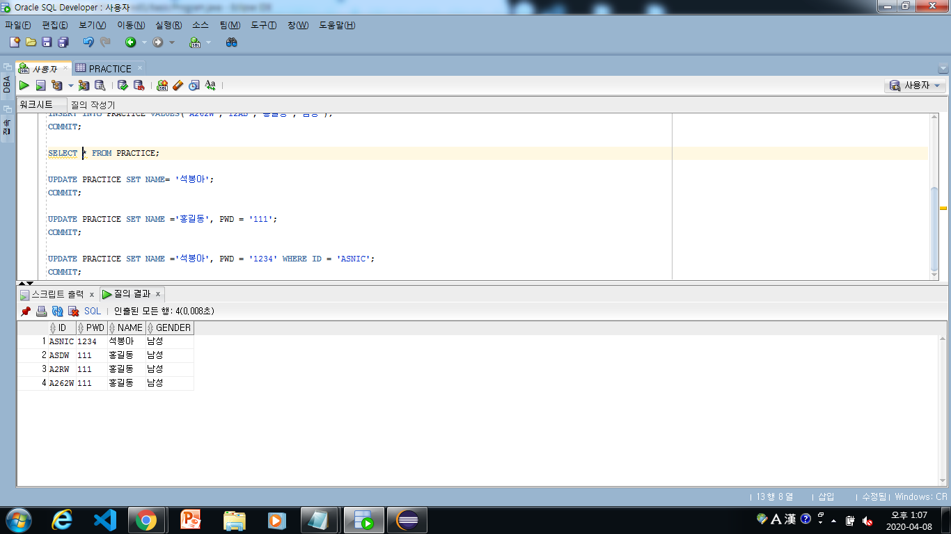 UPDATE practice SET PWD ='1234', NAME = '석봉아' WHERE ID = 'ASNIC';