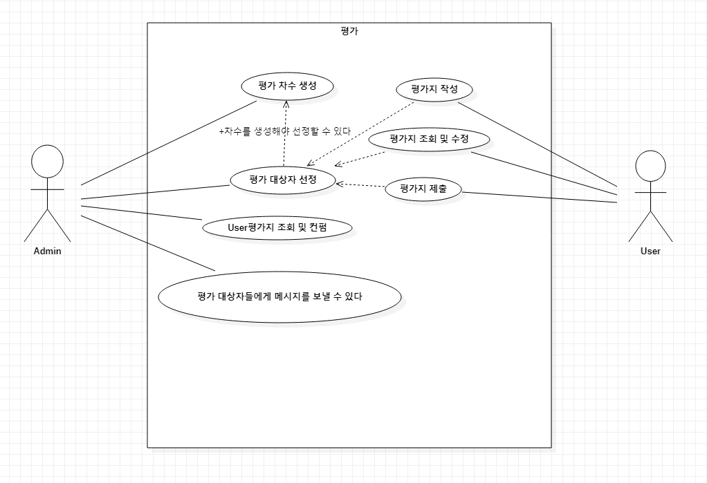 이 평가 시스템에서 액터인 User는 평가를 하기 위해 평가지를 작성할 것이고 제출하여 상급자에게 승인 요청을 한다고 하겠습니다. 또 관리자가 먼저 평가 차수를 만들고 이번 차수에 해당될 대상자를 선별한 사람만 평가를 볼 수 있다고 제약을 걸겠습니다.