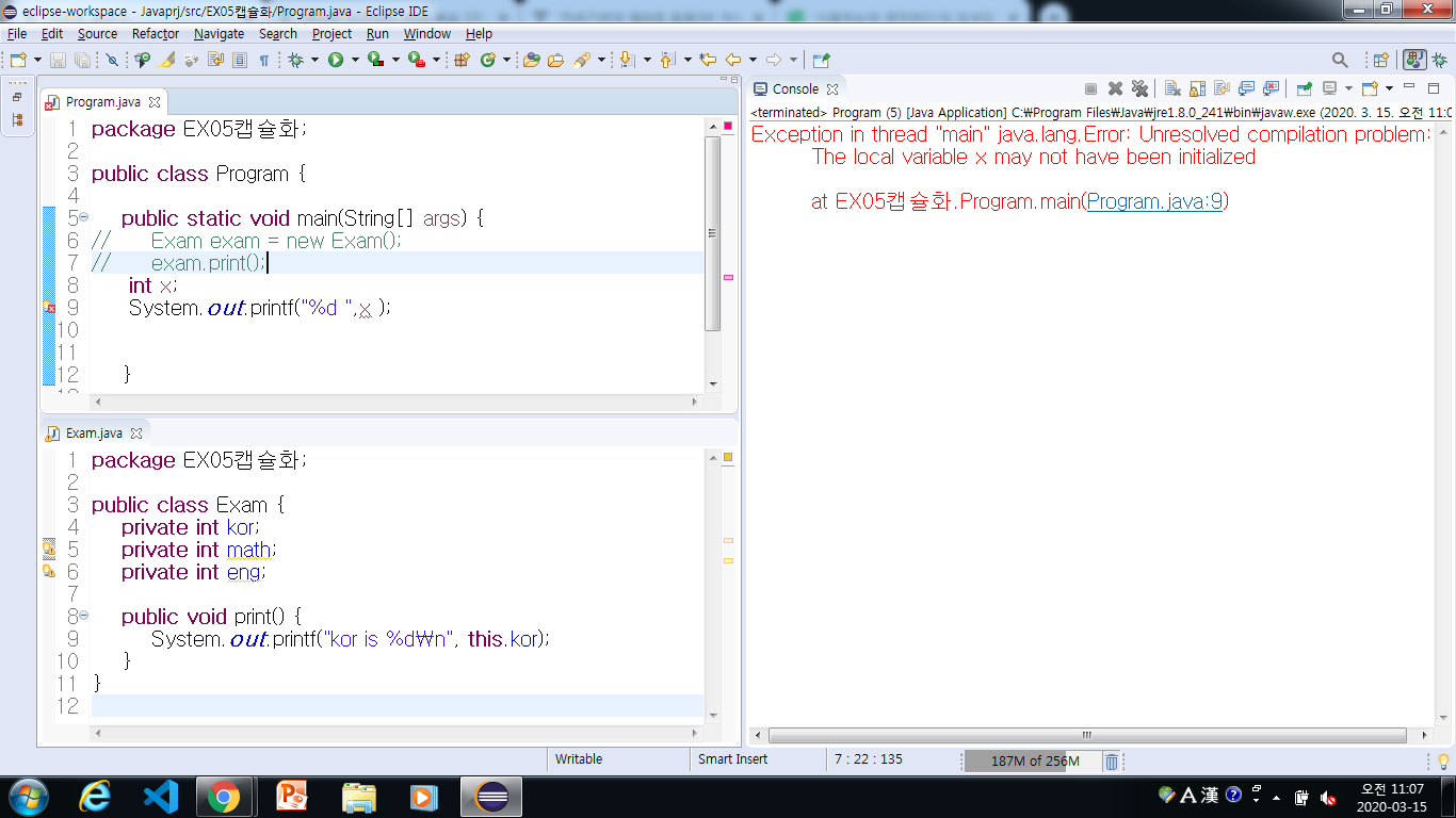 이렇게 초기값을 정해주게되면 모든 Exam 객체는 초기값을 3으로 가지게됩니다.