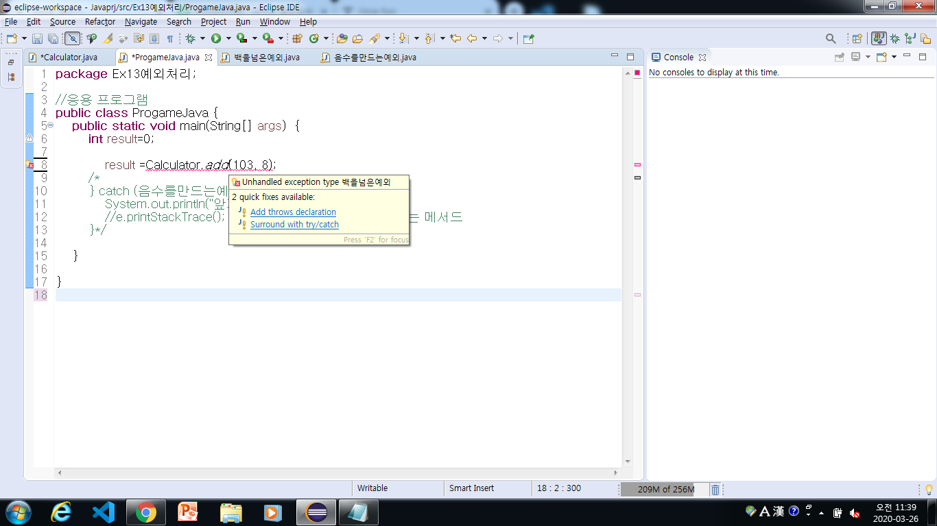 만약 예외에대한 처리를 catch문에서 메시지를 출력해주되 그 값에 대한 처리 또한 해주어야 잘되지 않을까 합니다.